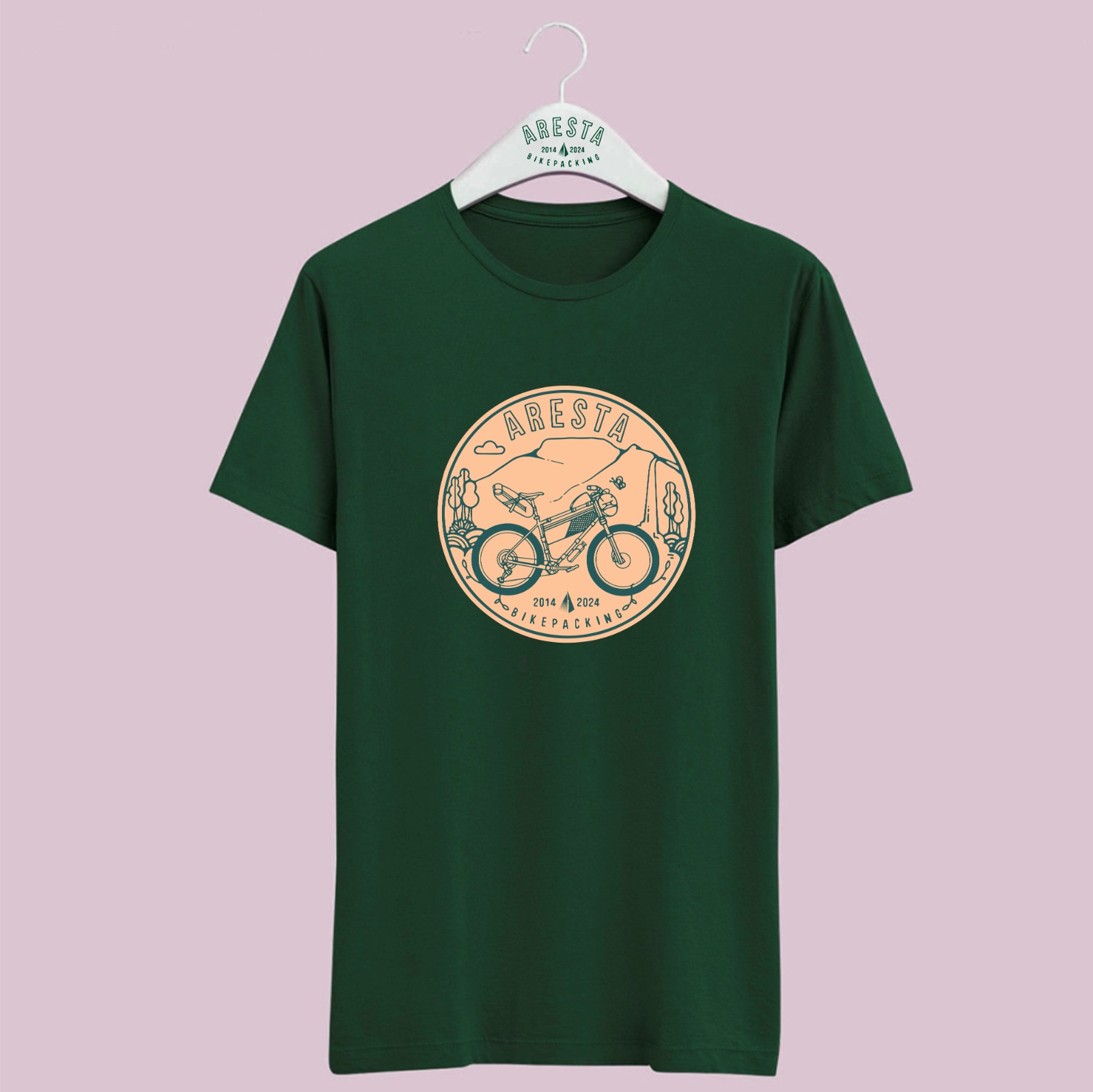 Camiseta Aresta 10 anos de Bikepacking, arte do Ninhol (https://ninhol.com/).